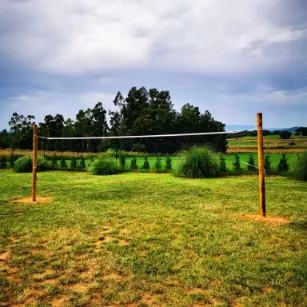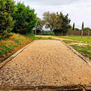 En esta zona del jardín de la casa rural encontrarás una pista de petanca y una red de bádminton para pasar muchas horas jugando y disfrutando del aire libre.